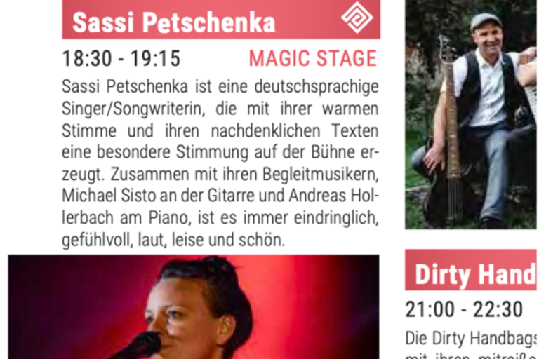 Ich bin Sassi Petschenka und eine deutsche Singer-Songwriterin. Seit vielen Jahren schreibe ich meine eigenen Songs und freue mich sehr, sie nun mit euch zu teilen. Hier erwartet euch meine warme Stimme und nachdenkliche Texte – verpackt in ruhigen, aber auch kraftvollen Songs. Ob solo mit Gitarre oder Piano oder gemeinsam mit meinen Musikern als Trio oder ganze Band: Wenn ich auf der Bühne stehe, wird es eindringlich, gefühlvoll, mal laut, mal leise – und immer besonders. Bei meinen Live-Auftritten möchte ich euch verzaubern und mitnehmen auf eine musikalische Reise durch ganz unterschiedliche Klangwelten und Locations.
