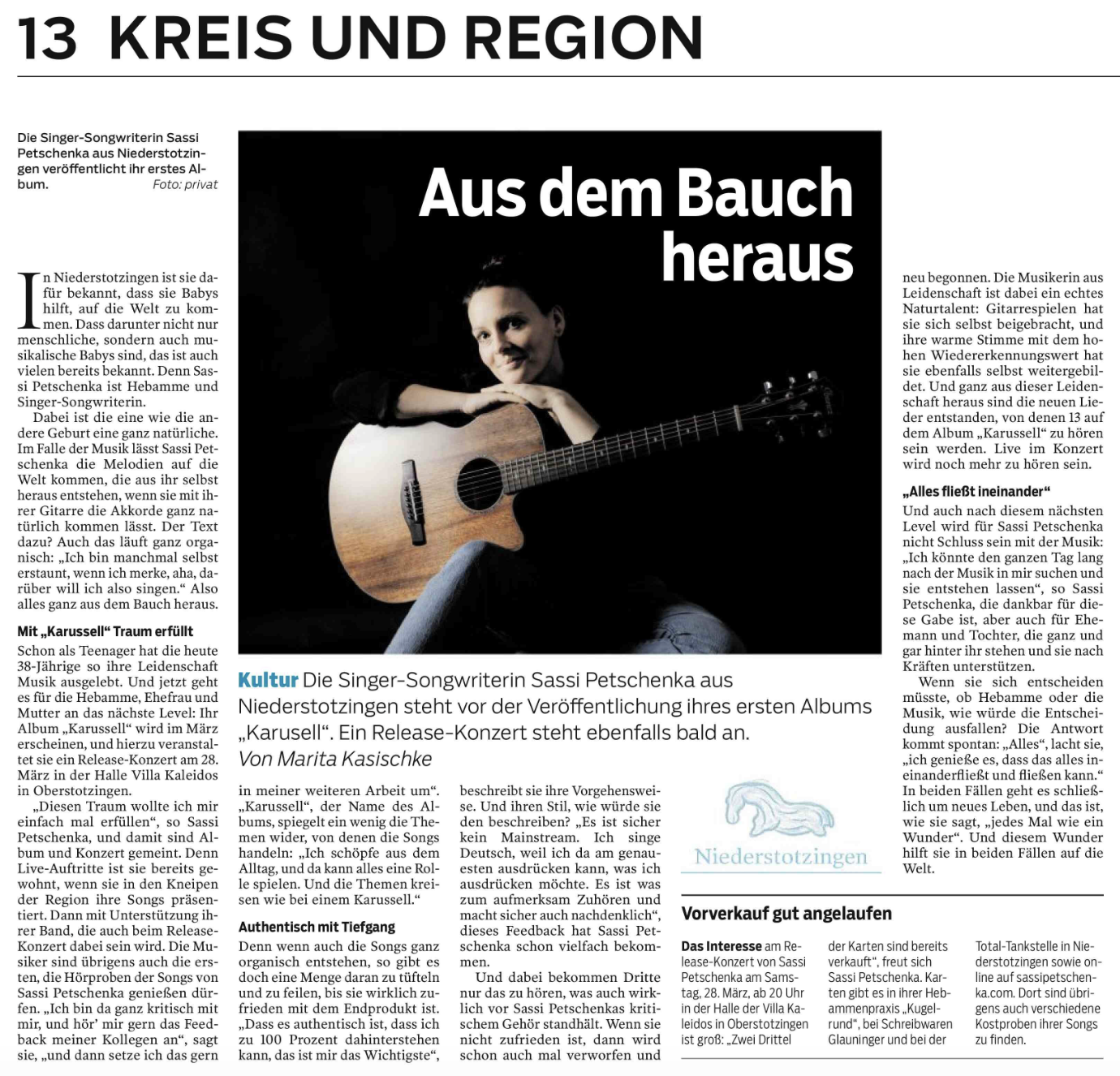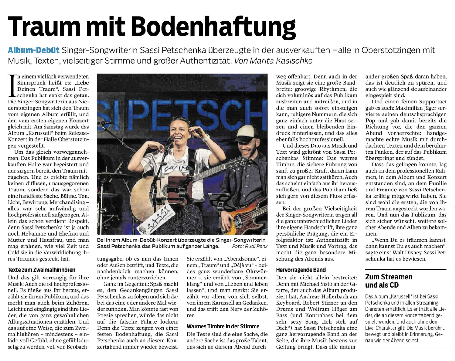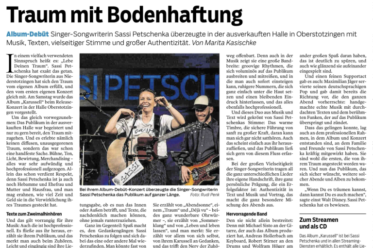 Ich bin Sassi Petschenka und eine deutsche Singer-Songwriterin. Seit vielen Jahren schreibe ich meine eigenen Songs und freue mich sehr, sie nun mit euch zu teilen. Hier erwartet euch meine warme Stimme und nachdenkliche Texte – verpackt in ruhigen, aber auch kraftvollen Songs. Ob solo mit Gitarre oder Piano oder gemeinsam mit meinen Musikern als Trio oder ganze Band: Wenn ich auf der Bühne stehe, wird es eindringlich, gefühlvoll, mal laut, mal leise – und immer besonders. Bei meinen Live-Auftritten möchte ich euch verzaubern und mitnehmen auf eine musikalische Reise durch ganz unterschiedliche Klangwelten und Locations.